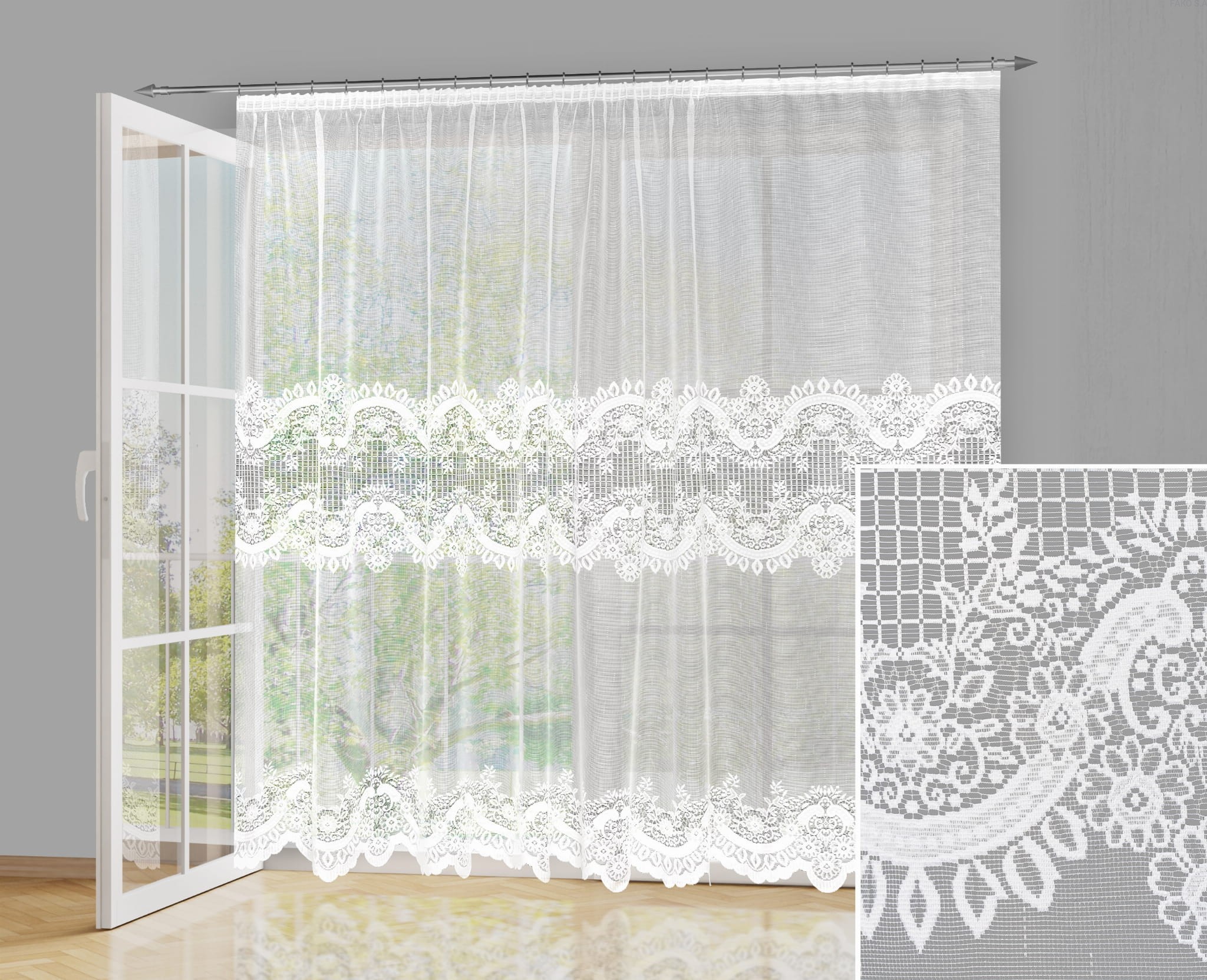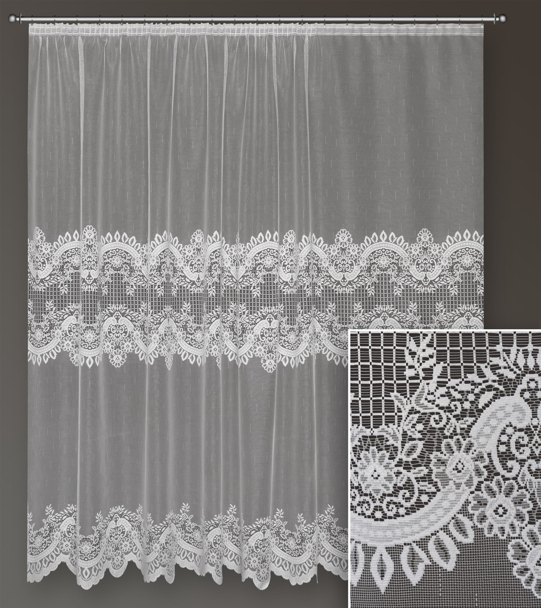 Firana żakardowa w metrażu w kolorze białym.